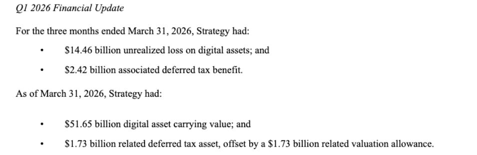 The backdrop to all of this is a balance sheet carrying $14.6 billion in unrealized losses on digital assets — a figure Strategy disclosed for the first quarter of 2026. That number reflects how far Bitcoin’s price has fallen from the highs at which much of the company’s holdings were acquired.
