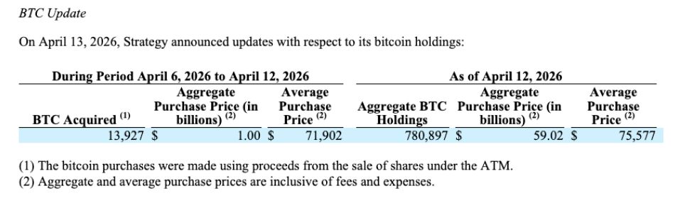 The 13,927 Bitcoin acquired between April 6 and 12 were purchased at an average price of $71,902 per coin. That figure sits below the company’s overall average buy price of $75,577 — meaning last week’s batch technically brought the cost basis down, not up.
