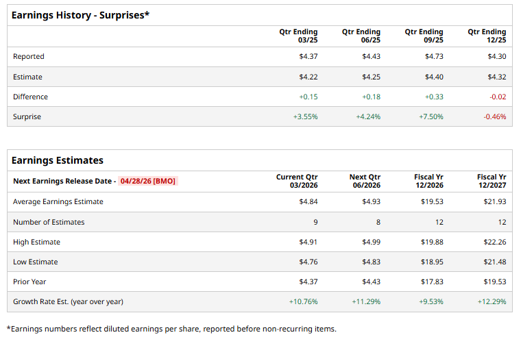 For the current year, analysts expect the company to report EPS of $19.53, up 9.5% from $17.83 in fiscal 2025. Moreover, its EPS is expected to rise by roughly 12.3% year over year to $21.93 in fiscal 2027.