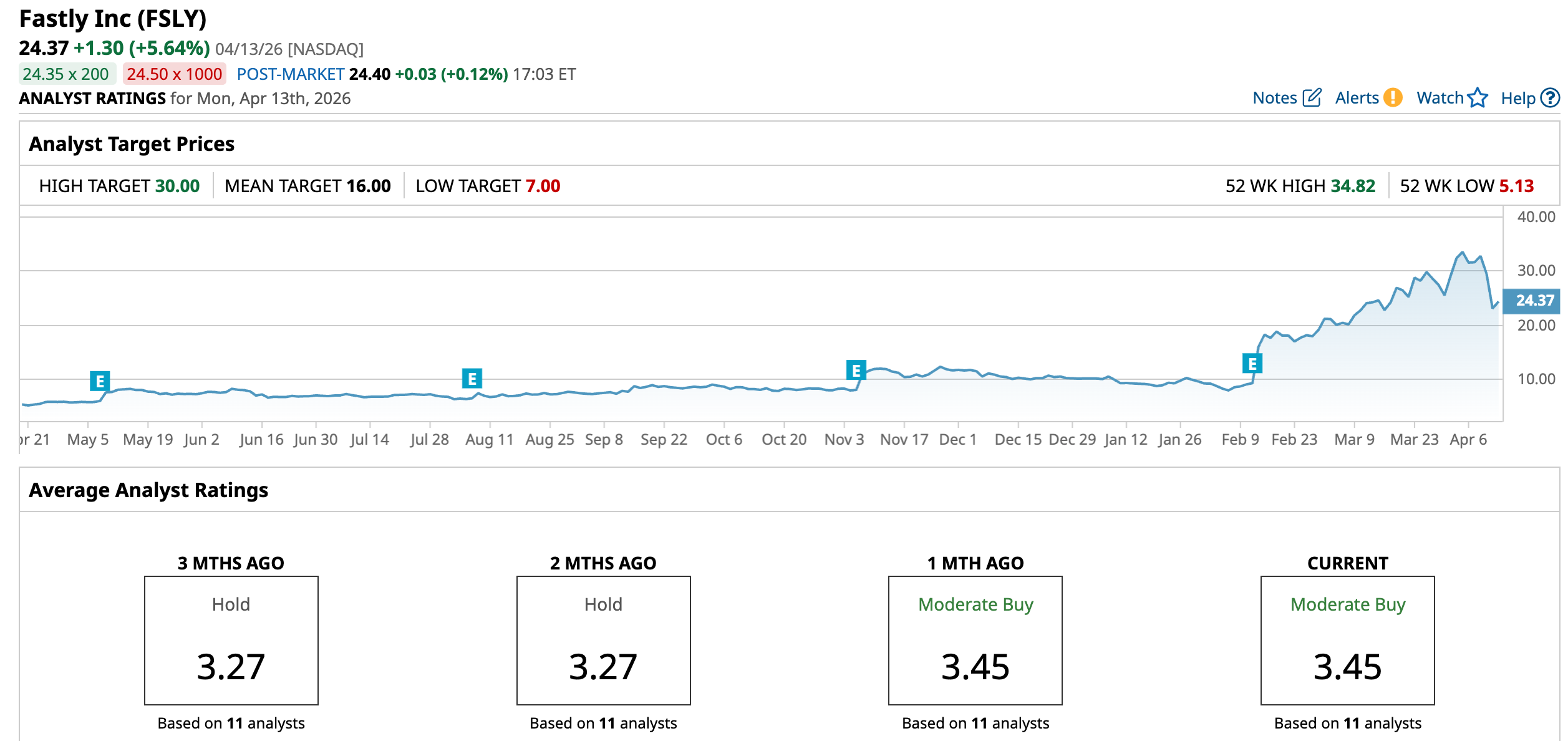 Fastly is still a sound favorite on Wall Street, with analysts awarding it a consensus “Moderate Buy” rating. Of the 11 analysts rating the stock, three analysts have rated it a “Strong Buy,” while seven analysts are playing it safe with a “Hold” rating, and one analyst rated it “Moderate Sell.” The consensus price target of $16 represents a 34.4% downside from current levels. However, the Street-high price target of $30 indicates a 23% upside.