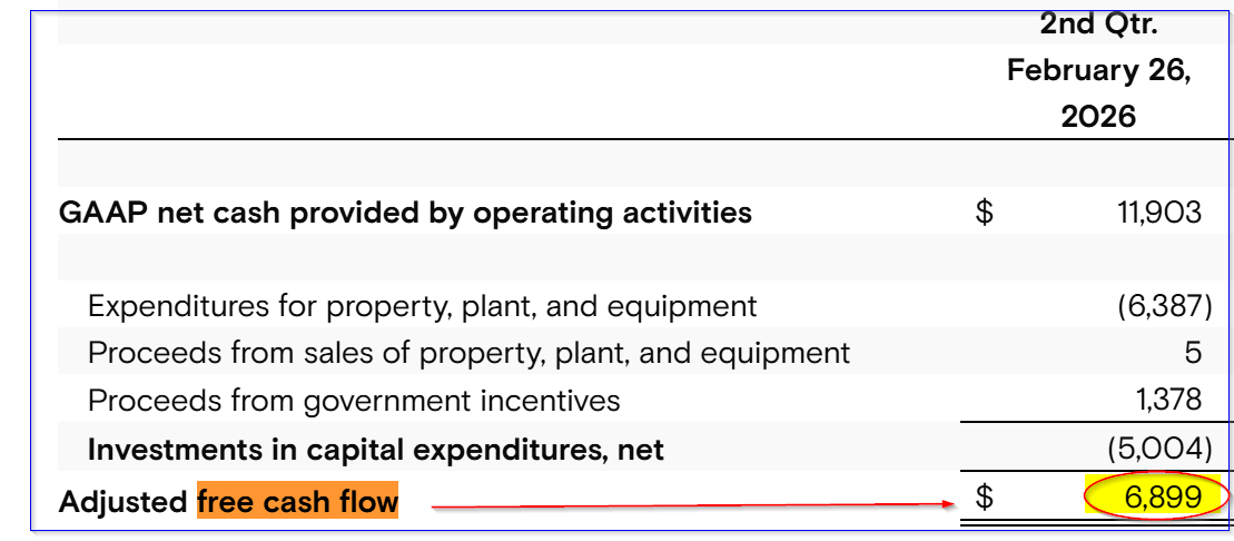 For example, $6.899 billion x 4 = $27.596 billion run rate adj. FCF