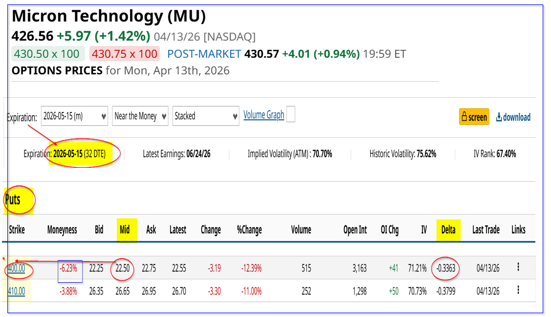 If this keeps up, it's the same as seeing MU stock rise to $475.93 over the next two months, for a buy-and-hold investor at today's price. Moreover, the extra income for a short seller of these puts lowers the potential buy-in point in case MU falls to the strike price.