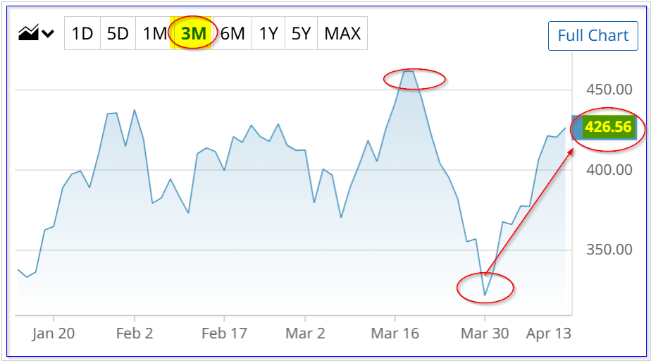 MU closed up 1.42% yesterday at $426.56. It's been on a tear upward since bottoming out on March 30 at $321.80. However, MU is still below a recent peak of $461.73 on March 18.