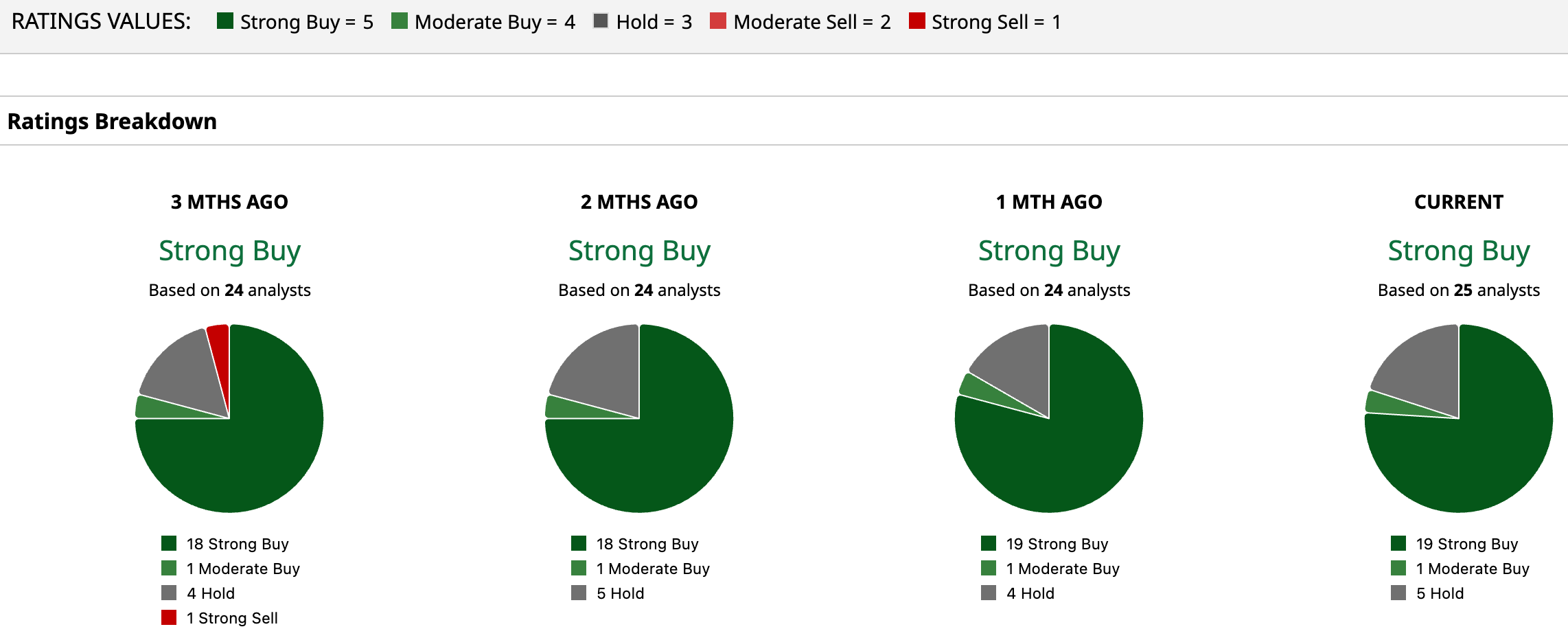 Seagate is receiving a lot of praise on Wall Street, with analysts awarding the stock an overall “Strong Buy” rating. Of the 25 analysts rating the stock, 19 have rated it a “Strong Buy,” one a “Moderate Buy,” and five a “Hold.” The consensus price target of $495.69 represents a 3.2% downside from current levels. However, the Street-high price target of $700 indicates a 34.3% upside.
