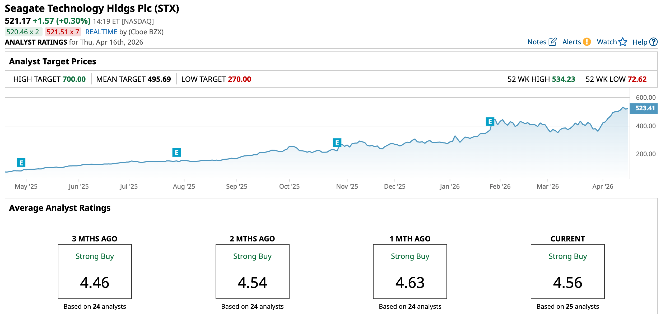 This month, analysts at Citigroup maintained a “Buy” rating on Seagate’s stock and raised the price target from $480 to $595. Analyst Asiya Merchant sees a solid demand backdrop for storage providers as AI demand accelerates.