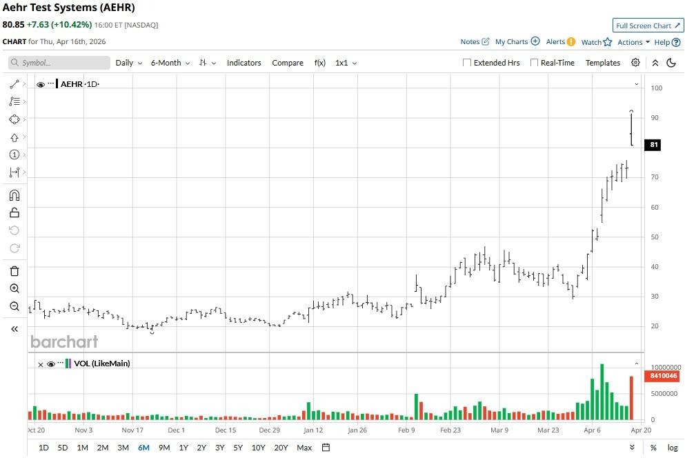 Including today’s surge, Aehr Test Systems shares are up more than 250% versus the start of 2026.