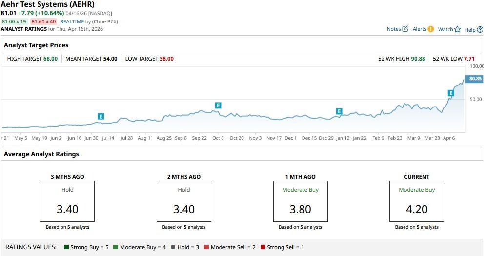 While the consensus rating on AEHR shares remains at “Moderate Buy,” the mean price target of about $54 signals potential downside of more than 30% from here.