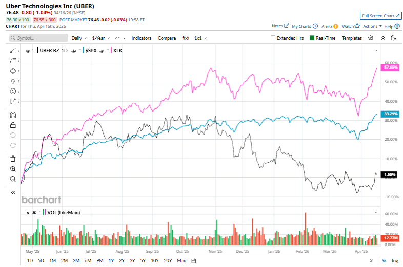 Shares of UBER have surged 4.7% over the past 52 weeks, underperforming the S&P 500 Index’s ($SPX17% rise and the State Street Technology Select Sector SPDR ETF’s (XLK23.4% return during the same time frame.