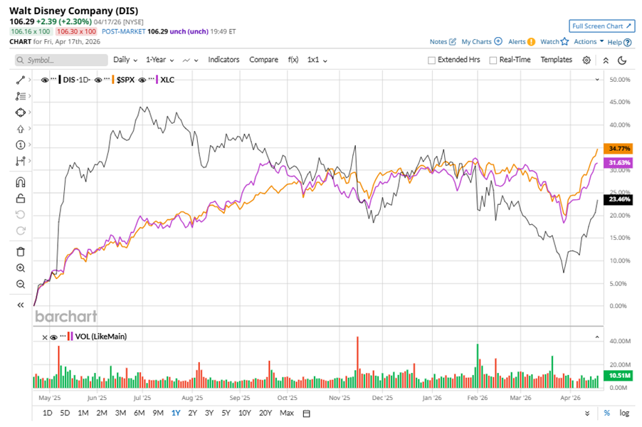 DIS stock has underperformed the S&P 500 Index’s ($SPX) 34.9% gains over the past 52 weeks, with shares up 25.3% during this period. Similarly, it underperformed the State Street Communication Services Select Sector SPDR ETF’s (XLC) 32% gains over the same time frame.