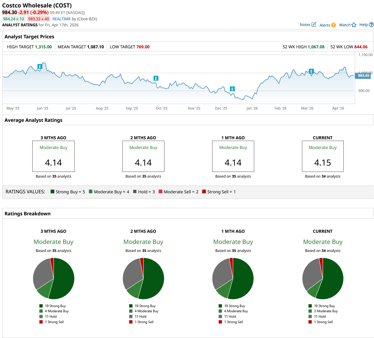 Out of the 34 analysts covering COST stock, 19 recommend “Strong Buy,” three recommend “Moderate Buy,” 11 recommend “Hold,” and one recommends “Strong Sell.” The average COST stock price target is $1,087.10, above the current price of $987.