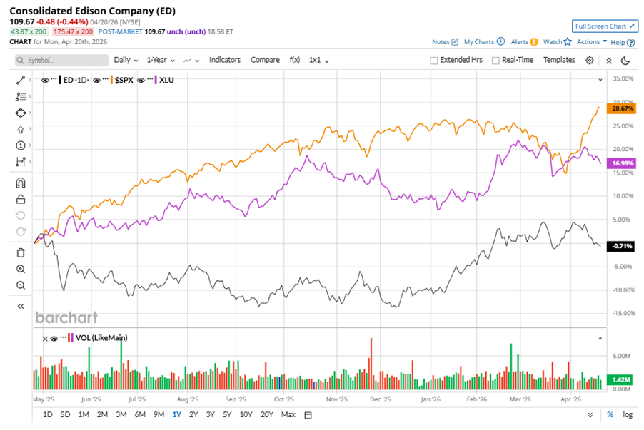 ED stock has underperformed the S&P 500 Index’s ($SPX) 34.6% gains over the past 52 weeks, with shares down 2.2% during this period. Similarly, it underperformed the State Street Utilities Select Sector SPDR ETF’s (XLU) 17.7% gains over the same time frame.