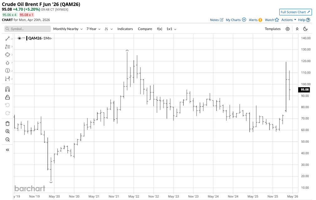 The monthly continuous seven-year NYMEX WTI crude oil chart highlights the explosive move in March 2026.