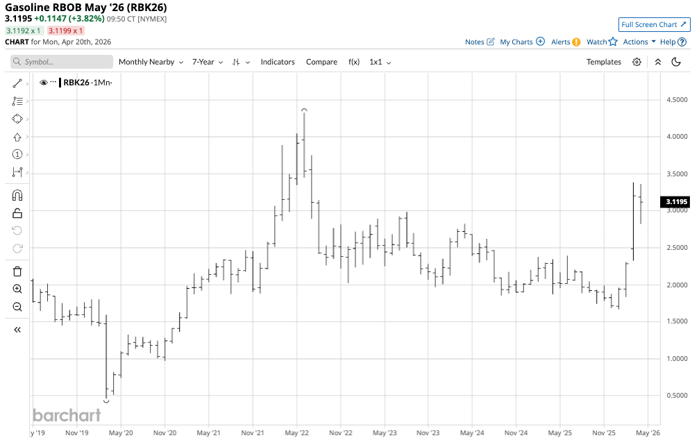 NYMEX RBOB gasoline futures rose 84.9% from a low of $1.8305 in February 2026 to a high of $3.3854 per gallon wholesale in March 2026.