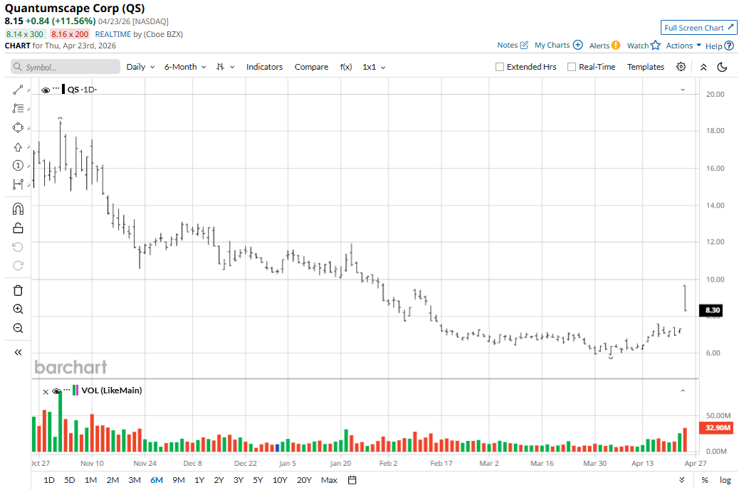 QuantumScape (QS) shares are up more than 14% in Thursday morning trading following the company’s first-quarter 2026 earnings report, which delivered a narrower-than-expected loss and signaled meaningful business momentum across multiple fronts. The company reported a quarterly loss of $0.16 per share, beating the consensus estimate of an $0.18 loss, while its adjusted EBITDA loss of $63.2 million came in line with expectations. Customer billings for the quarter totaled $11 million, reflecting a combination of customer development activities and ecosystem partner payments.