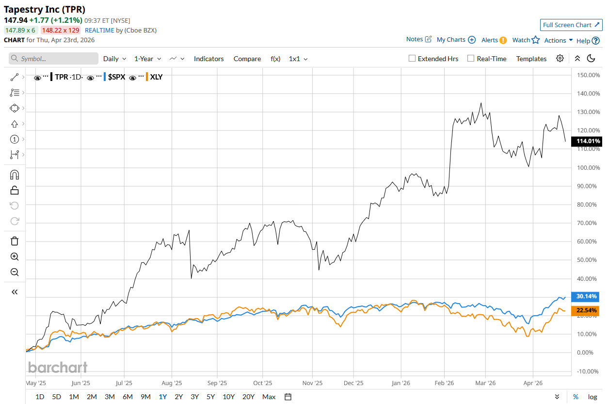 TPR stock has surged 119.2% over the past 52 weeks, outperforming the S&P 500 Index’s ($SPX34.6% rise and the State Street Consumer Discretionary Select Sector SPDR ETF’s (XLY24.2% return during the same time frame.