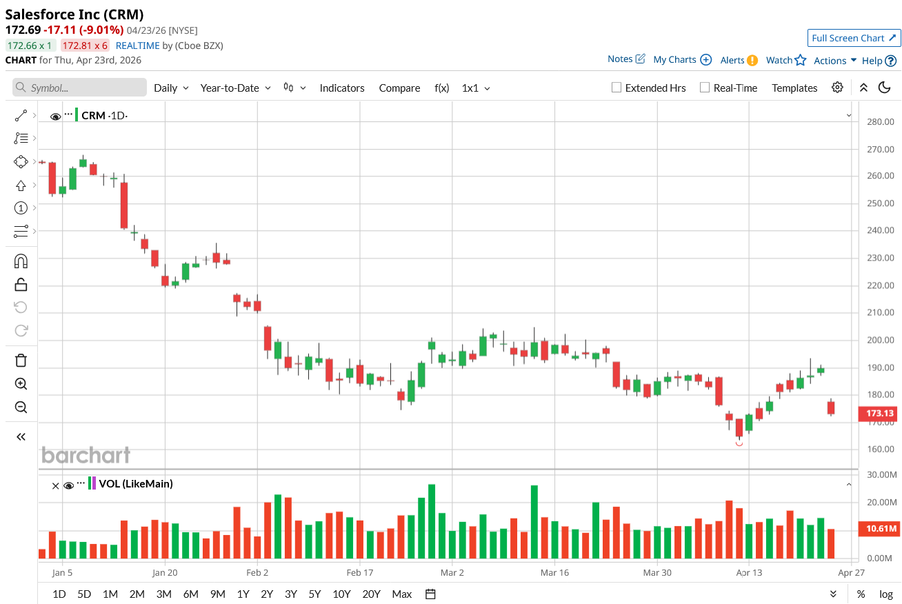 Burry said in a post that he planned to initiate a position in Salesforce the following day. Burry pointed out that the company does not depend on the private credit markets currently under stress, which he believes provides a “margin of safety.” If he followed through on his plan, his purchase price for CRM stock fell within the April 16 daily trading range of $178.57 to $184.55. Zooming in, since Burry was expected to buy the stock early Thursday, the likely purchase range narrows to roughly $179 to $184. In any case, his position is currently in the red, as CRM stock is taking another big beating today.