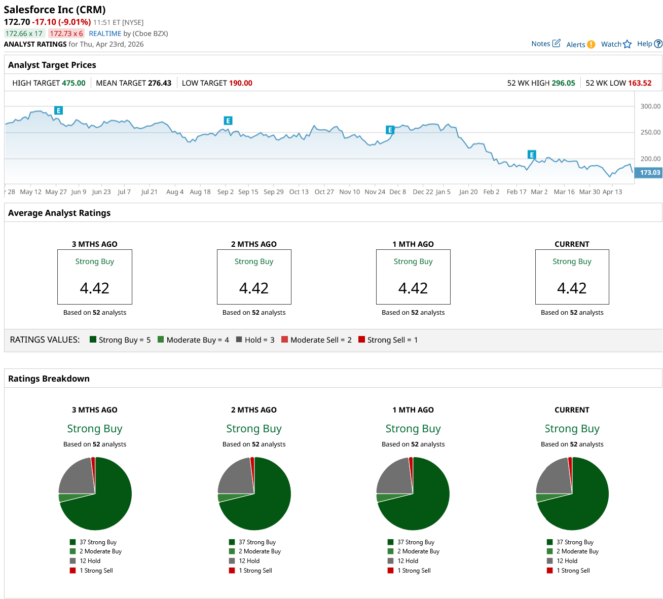 Still, Wall Street analysts remain bullish on Salesforce, giving the stock a consensus “Strong Buy” rating. Out of the 52 analysts covering CRM stock, 37 rate it as a “Strong Buy,” two advise a “Moderate Buy,” 12 give a “Hold” rating, and one considers it a “Strong Sell.” The mean price target for CRM stock is $276.43, which is 45.6% above Wednesday’s closing price.