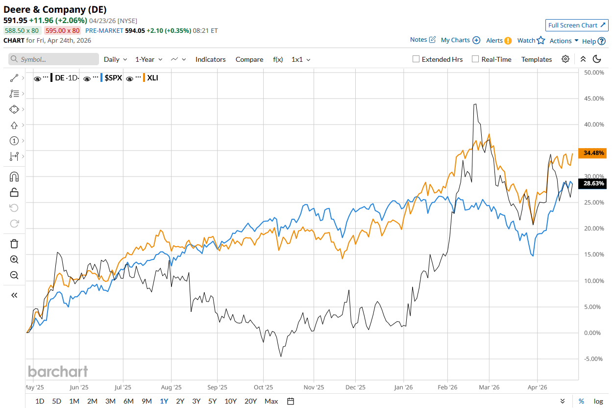 DE’s stock has surged 27.9% over the past 52 weeks, underperforming the S&P 500 Index’s ($SPX32.2% rise and the State Street Industrials Select Sector SPDR ETF’s (XLI37.9% return during the same time frame.