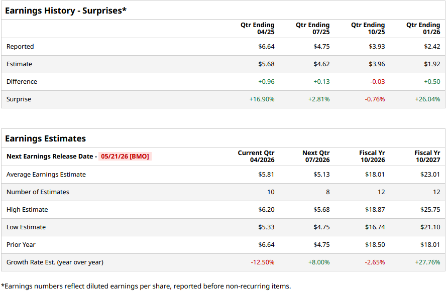 Moline, Illinois-based Deere & Company (DE) engages in the manufacture and distribution of various equipment worldwide. The company has a market cap of $159.9 billion and operates through Production and Precision Agriculture, Small Agriculture and Turf, Construction and Forestry, and Financial Services segments. DE is expected to release its Q2 2026 earnings on Thursday, May 21, before the market opens.