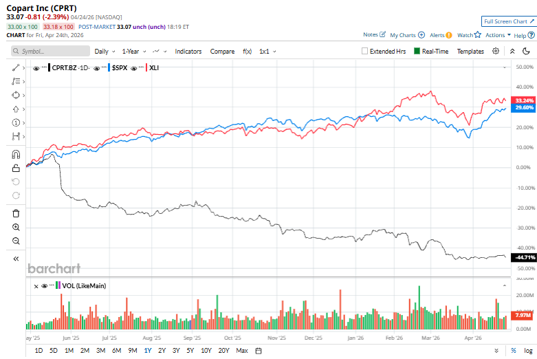 Copart has dipped 46.6% over the past 52 weeks, significantly lagging behind both the S&P 500 Index's ($SPX30.6% return and the State Street Industrial Select Sector SPDR Fund’s (XLI33.7% uptick over the same time period.