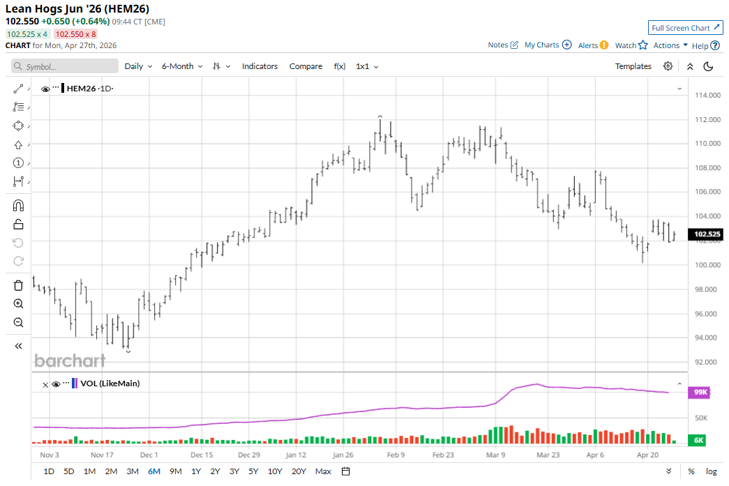 June lean hog (HEM26) futures on Friday fell $1.55 to $101.90 but for the week were up 85 cents. The futures market saw technical selling pressure to end the trading week as prices remain trapped in a downtrend on the daily bar chart.