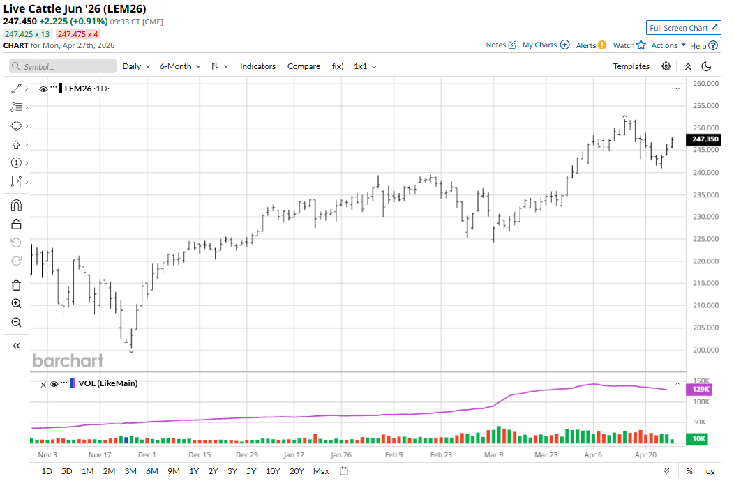 June live cattle (LEM26) futures on Friday rose $1.725 to $245.225 but for the week were down $2.475. May feeder cattle (GFK26) futures Friday gained $2.025 to $360.90 and for the week were down $4.375.