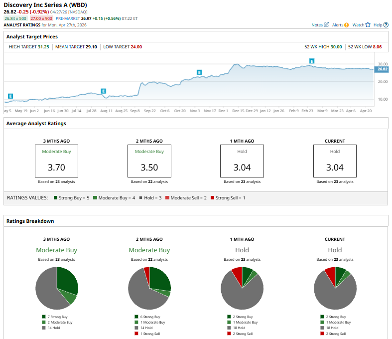 Among the 23 analysts covering WBD stock, the consensus is a “Hold.” That’s based on two “Strong Buy” ratings, one “Moderate Buy,” 18 “Holds,” and two “Strong Sells.”