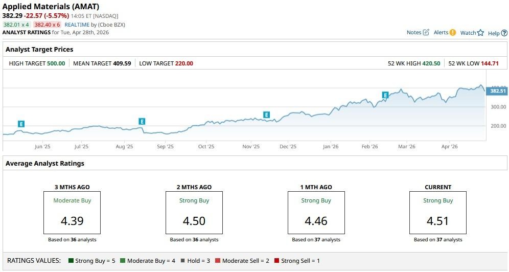 According to Barchart, the consensus rating on AMAT stock sits at “Strong Buy” currently, with price targets as high as $500, indicating potential upside of more than 30% from here.