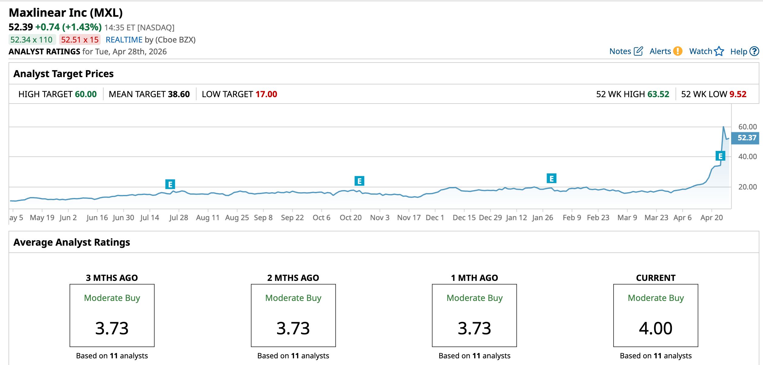 In the wake of MXL's Q1 report, investment bank Stifel raised its price target on the name to $49 from $34 and kept a “Buy” rating on the stock. One of the key reasons for Stifel's bullish stance was the strong demand for Keystone among a number of Maxlinear's larger customers.