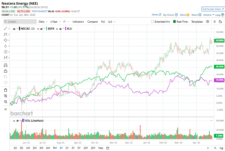 On Apr. 23, NextEra reported a solid Q1 2026 results, and its shares popped 6.9%. Its adjusted earnings rose about 10% year over year to roughly $2.28 billion, and EPS reached $1.09, coming in ahead of expectations. The growth was supported by steady performance across its core operations.