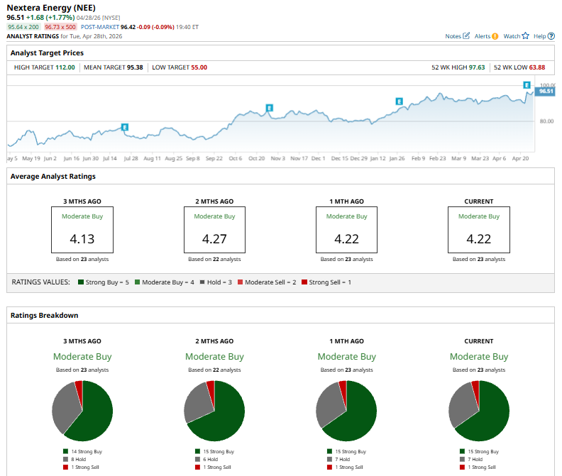 Among the 23 analysts covering NEE stock, the consensus is a “Moderate Buy.” That’s based on 15 “Strong Buy” ratings, seven “Holds,” and one “Strong Sell.”