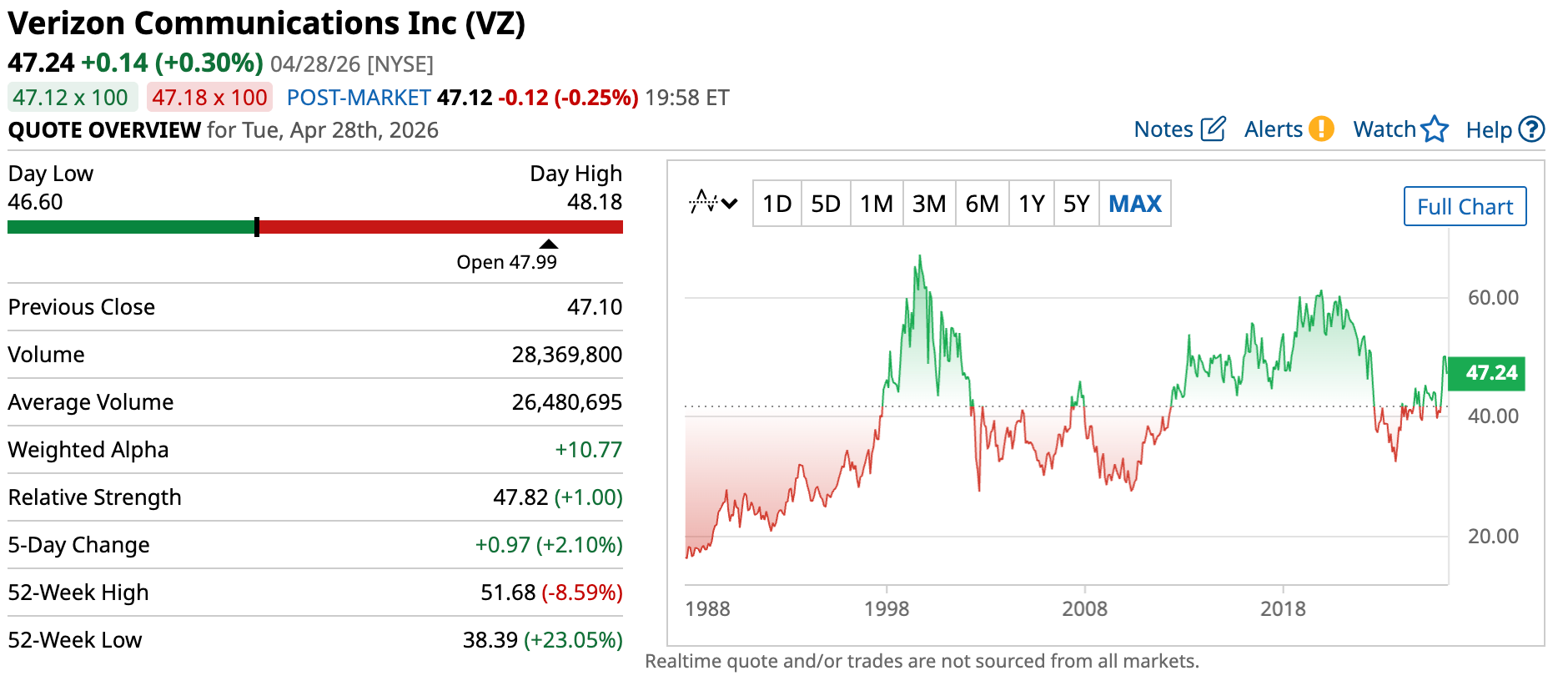 Verizon stock is trading at approximately $47.24.