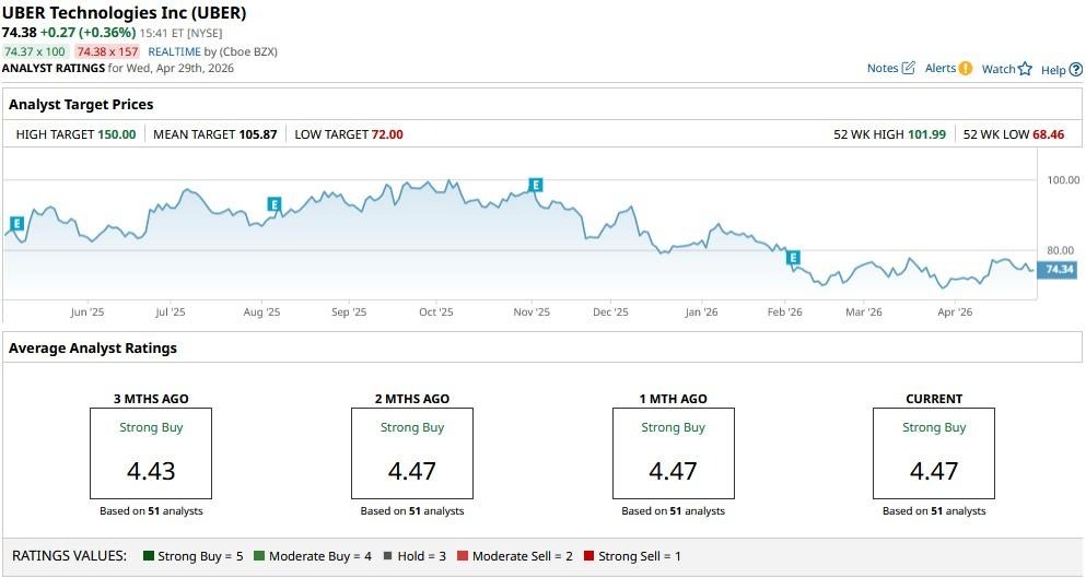 The consensus rating on UBER stock sits at “Strong Buy” with the mean price target of nearly $106, indicating potential upside of more than 40% from here.