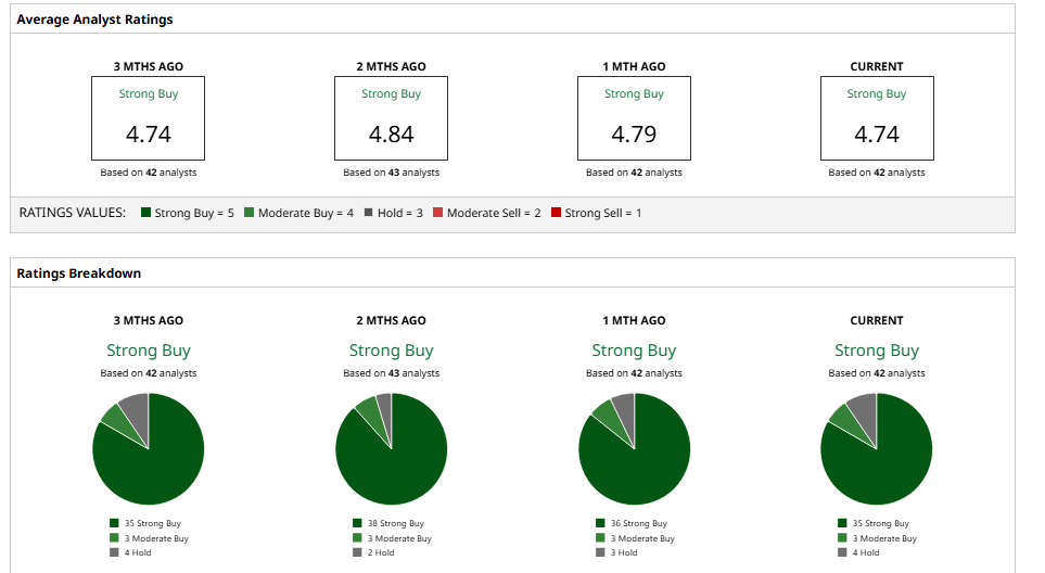 According to compiled data from Barchart, AVGO stock carries a “Strong Buy” consensus. Out of 42 analysts, most recommend buying the shares, with a smaller number suggesting holding positions. The average 12-month price target stands near $469, implying roughly 16% upside from current levels.