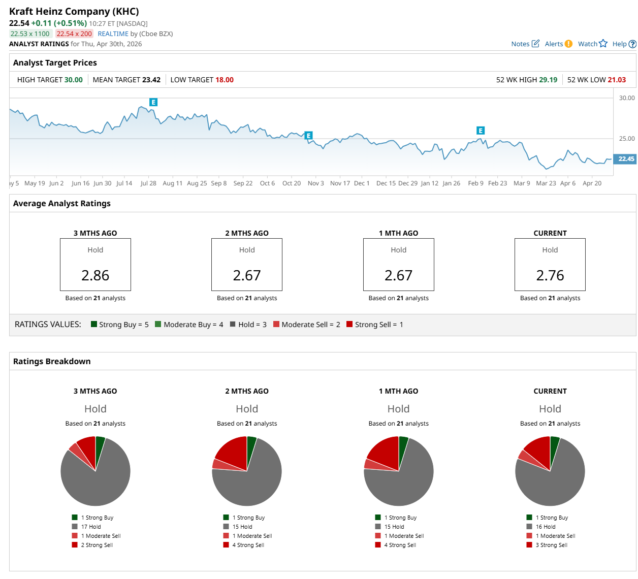On Apr. 23, Morgan Stanley (MS) maintained an “Underweight” rating on KHC and lowered its price target to $22.