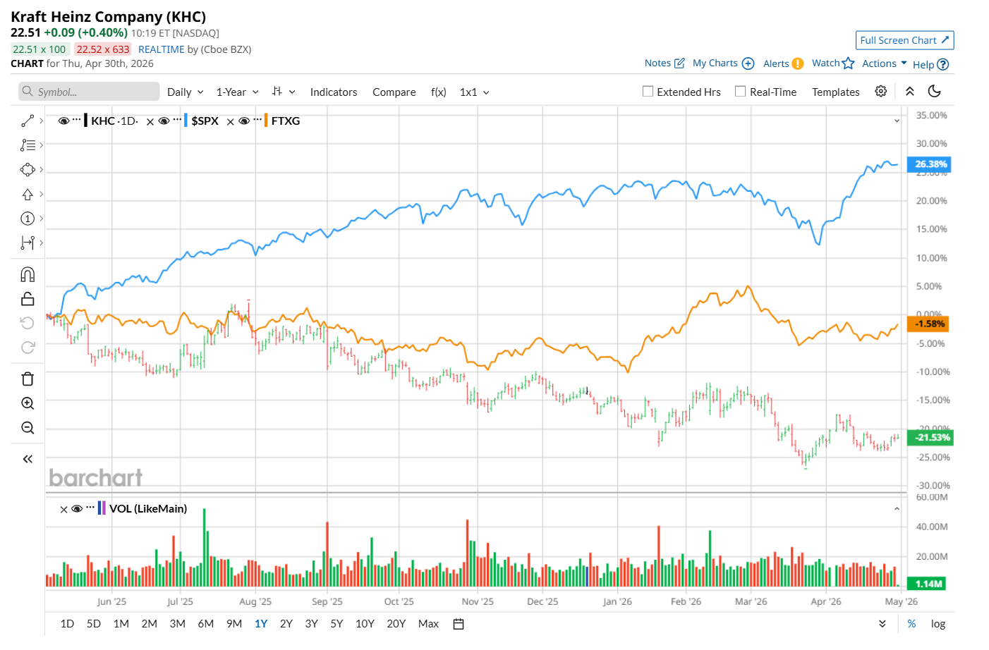 This food and beverage company has notably underperformed the broader market over the past 52 weeks. Shares of KHC have declined 22.6% over this time frame, while the broader S&P 500 Index ($SPX) has gained 28.3%. Moreover, on a YTD basis, the stock is down 7.2%, compared to SPX’s 4.2% rise.