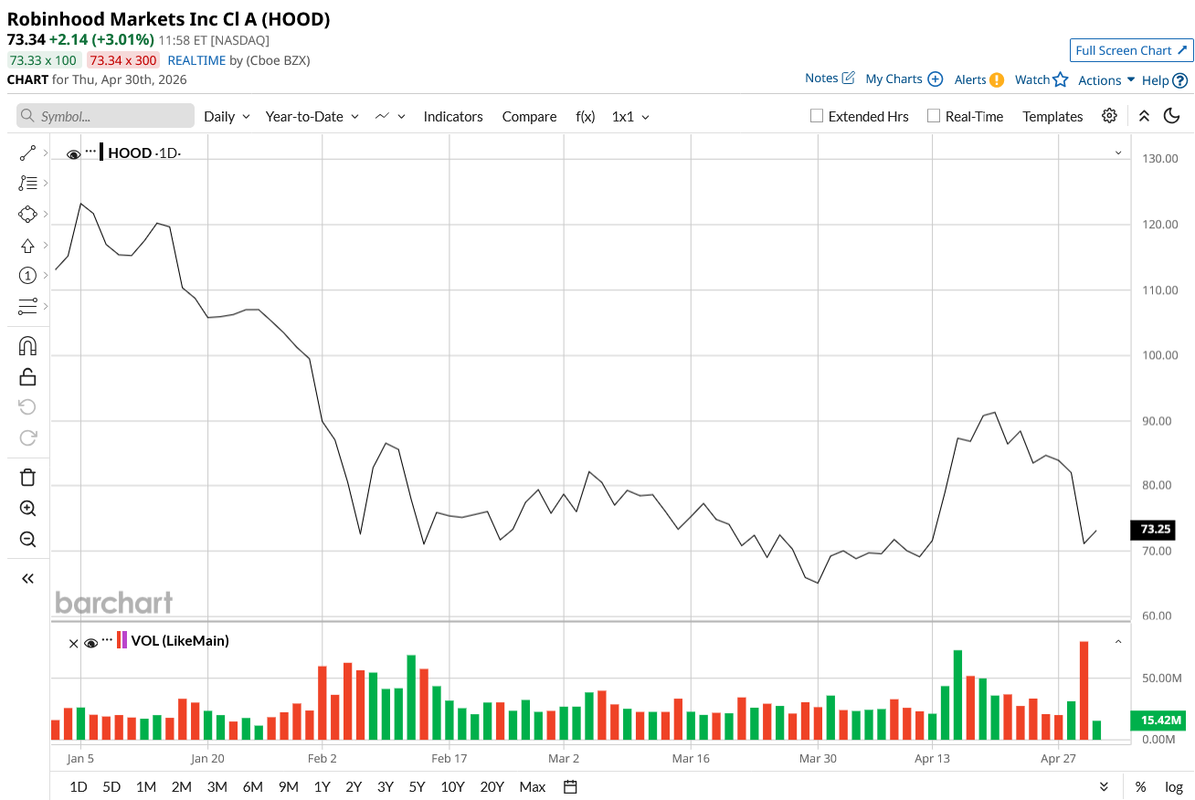 Currently valued at a market cap of $73.9 billion, HOOD stock is down 35% on a year-to-date (YTD) basis.