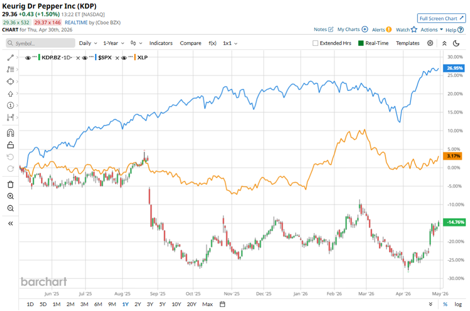 Narrowing the focus, shares of Keurig Dr Pepper have also lagged behind the State Street Consumer Staples Select Sector SPDR ETF’s (XLP) 2.8% return over the past 52 weeks.