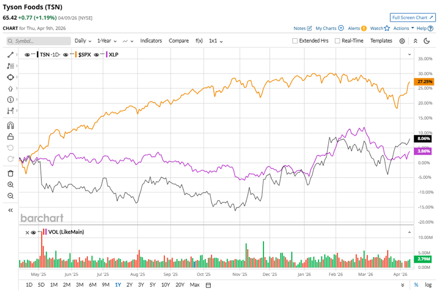 TSN stock has underperformed the S&P 500 Index’s ($SPX) 25.1% gains over the past 52 weeks, with shares up 9.5% during this period. However, it outperformed the State Street Consumer Staples Select Sector SPDR ETF’s (XLP) 5.2% returns over the same time frame.