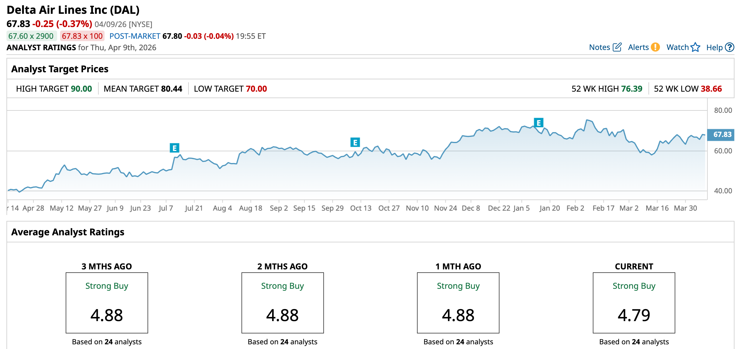 That helps explain why Citigroup lowered its Delta price target from $87 to $77 in late March, but kept a “Buy” rating, saying the cut was mainly tied to higher fuel costs, not a broken long-term story. UBS analyst Thomas Wadewitz also kept a "Buy" rating and set a $75 target when the stock closed at $59.57, showing a similar view that short-term pressure does not change the bigger picture.