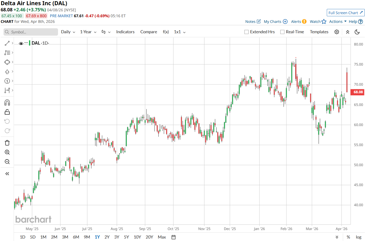 At this point, Delta’s rally looks less like a random pop and more like investors re-pricing its earning power, even if it’s built on a fragile ceasefire. With a solid balance sheet, the Trainer refinery helping on fuel, ongoing fleet upgrades, and a full slate of “Strong Buy” ratings, any pullbacks from here look more like chances to add than signs the story is broken. If the truce holds and oil doesn’t spike again, Delta’s stock is more likely to work its way up toward the $80 area over the next year or so than give back the whole move, but it probably won’t be a smooth ride.