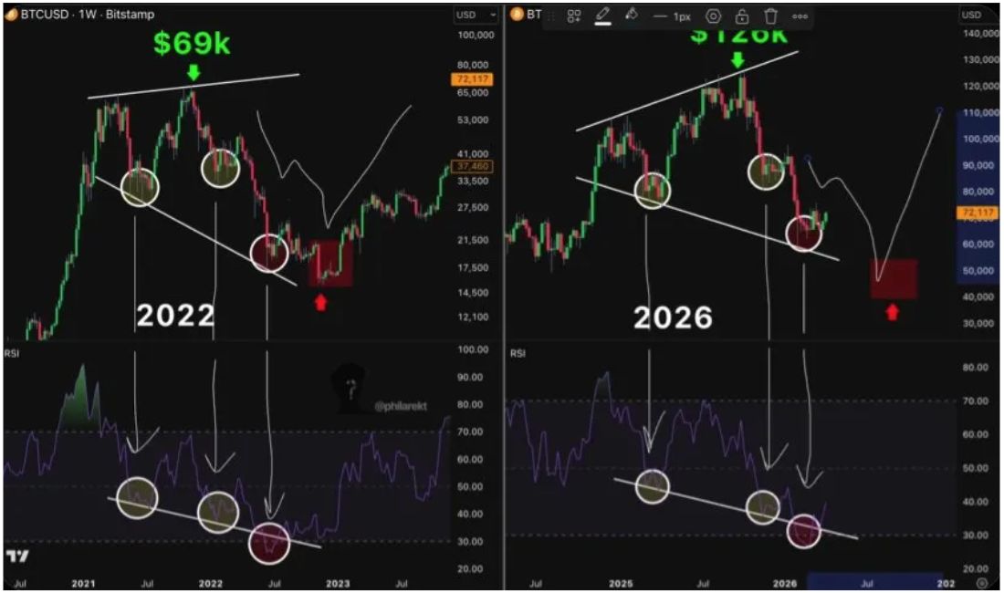 El analista de criptomonedas philarekt publicó una advertencia en X esta semana, identificando lo que describió como «el fractal macro más peligroso» que actualmente se está desarrollando en la estructura de precios de Bitcoin. El caso técnico se basa en una comparación lado a lado de dos gráficos semanales de Bitcoin: el ciclo de 2021 a 2023 en la izquierda y el ciclo actual en la derecha.