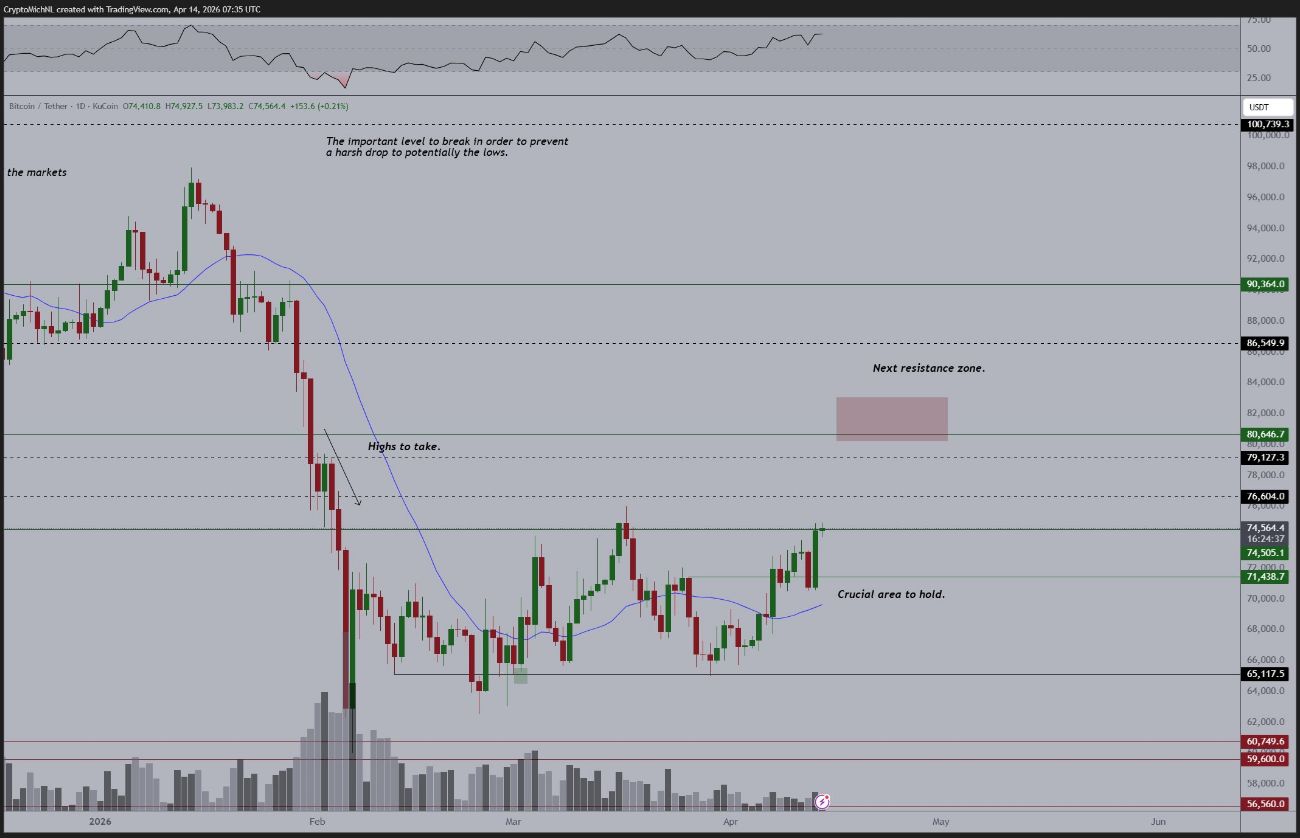Un nivel es más importante que el resto en este momento: $75,000. Según Van de Poppe, romper esa resistencia con un volumen fuerte detrás de ella prepara el escenario para la carrera a $80,000-$85,000 — donde la presión de venta más pesada de la historia de los gráficos de largo plazo tiende a sentarse. Bitcoin ya había empujado más allá de $75,000 para cuando se distribuyó el análisis.