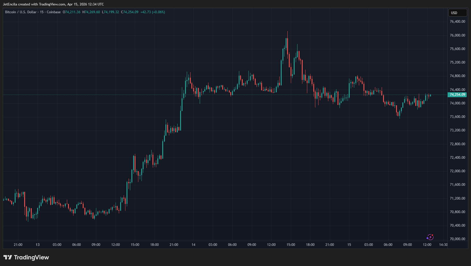 Hizo la llamada en X esta semana, señalando un mercado global en recuperación como la principal fuerza detrás del movimiento esperado. Bitcoin se negociaba alrededor de $74,500 en el momento de su publicación, subió más del 5% en 24 horas, con un volumen de negociación que saltó más del 90% en el mismo período.