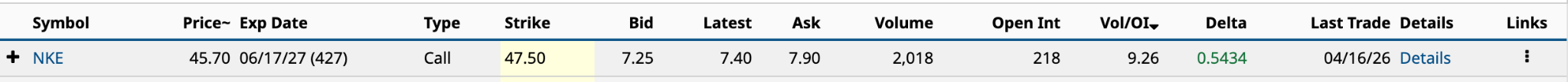More importantly, of the 2,018 June 17/2027 $47.50 call contracts traded, 2,000 were for one trade at 3:17 p.m. ET. Somebody felt spending $1.45 million on Nike LEAPS was worth it.
