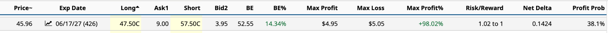 Based on the June 17/2027 $47.50 call, you can use a bull call spread to lower the overall cost of the strategy. In the example below from this morning’s trading, the ask price of the $47.50 call is $9.00. You could buy one call for $900 or about 19.6% of its share price. Or, you could also sell a June 17/2027 $57.50 call that’s 25% OTM, receiving $395 in premium income, reducing the overall cost, or net debit, to $505, lowering the cost by 44%.