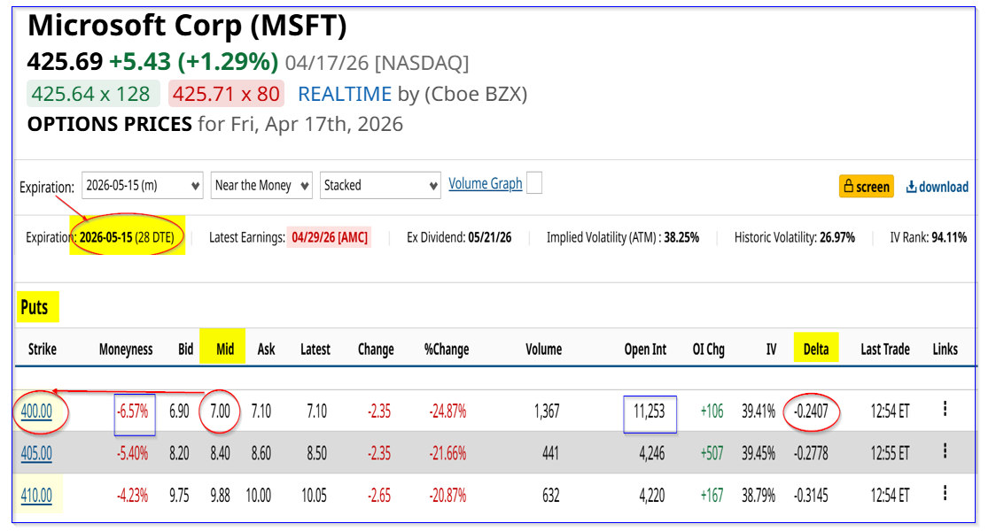 MSFT puts expiring May 15 - Barchart - As of April 17