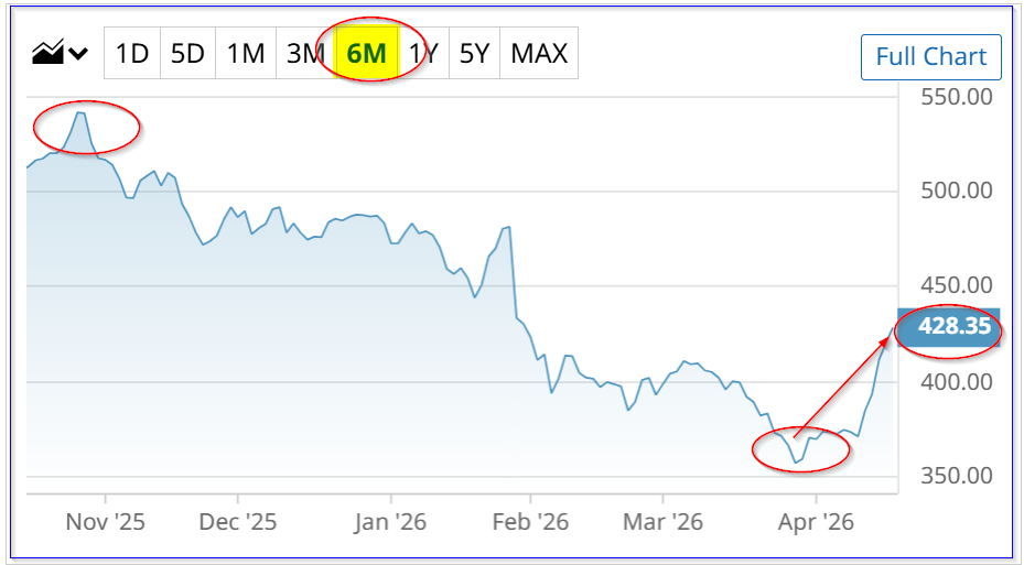 MSFT is trading at $426.84 in midday trading today, up about 2% and well over its recent lows. However, it's still well below its 6-month peak of $541.55 on Oct. 29, 2025.