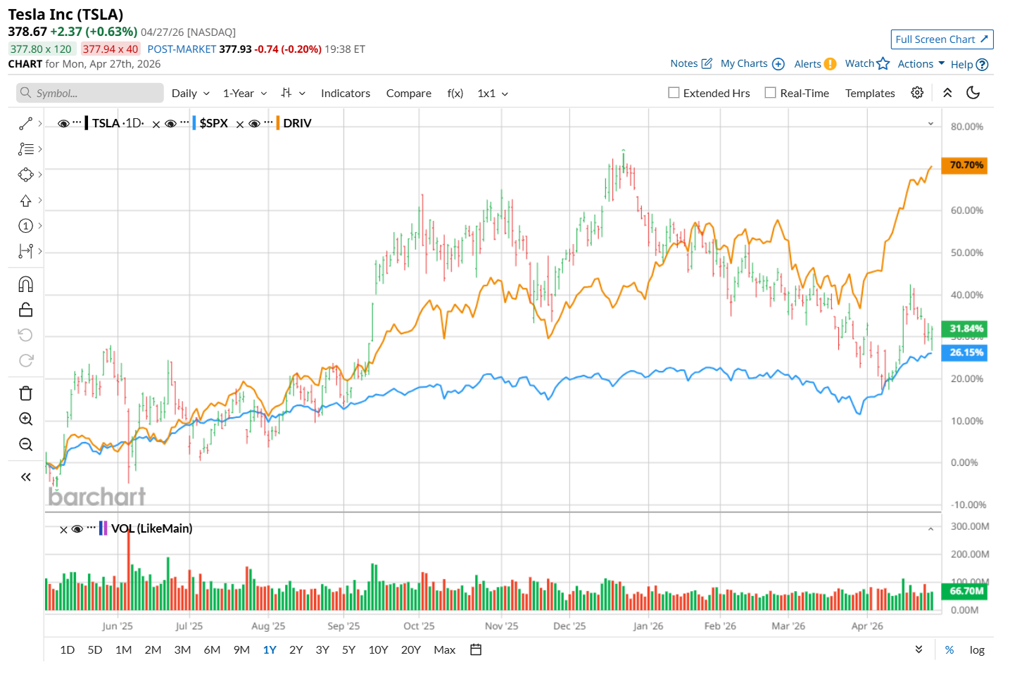 Narrowing the focus, TSLA has trailed the Global X Autonomous & Electric Vehicles ETF (DRIV), which soared 75.1% over the past 52 weeks and 22.9% on a YTD basis.