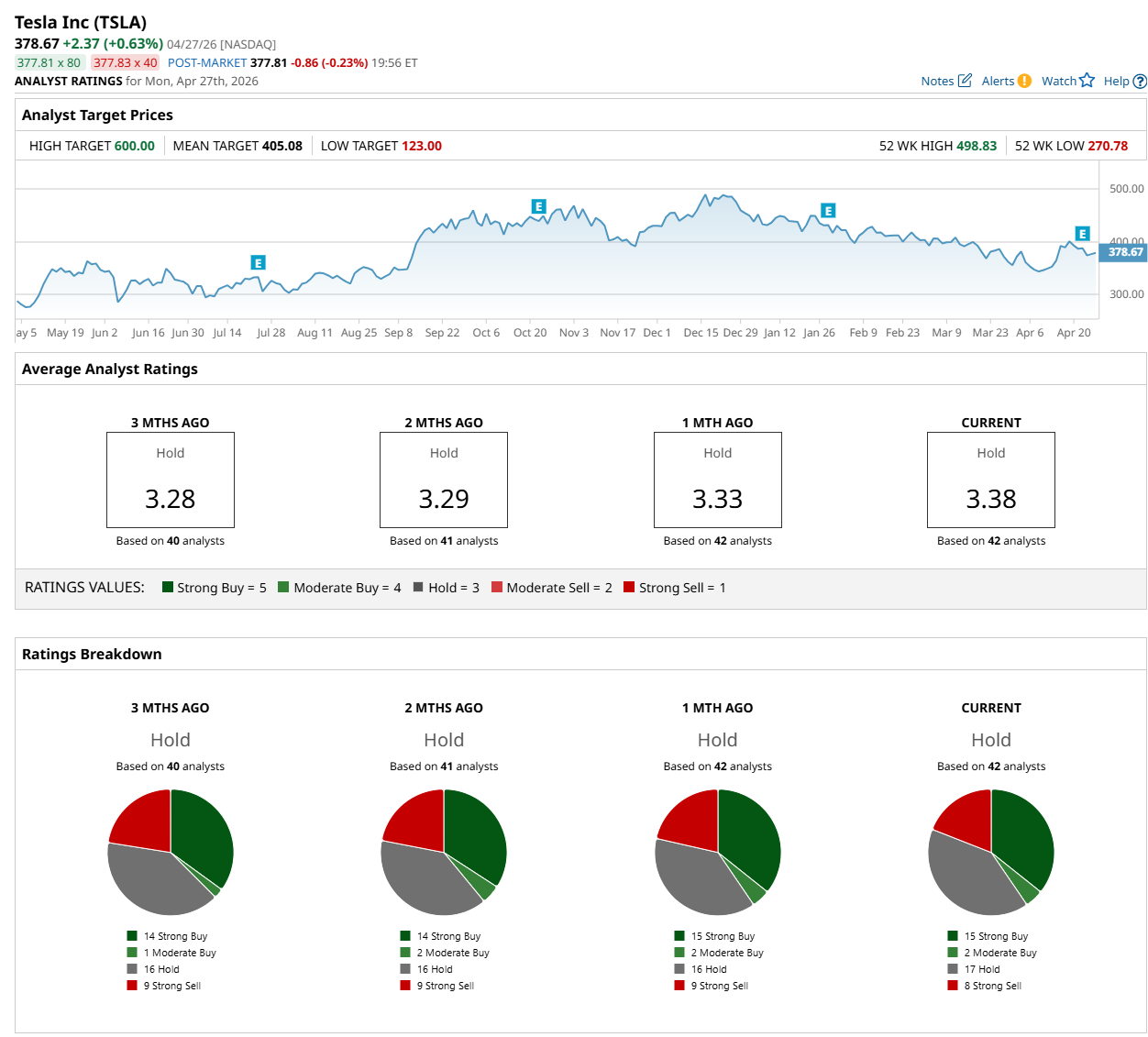 On Apr. 27, Glenn Thum from Phillip Securities maintained a “Sell” rating on Tesla, with a price target of $220.